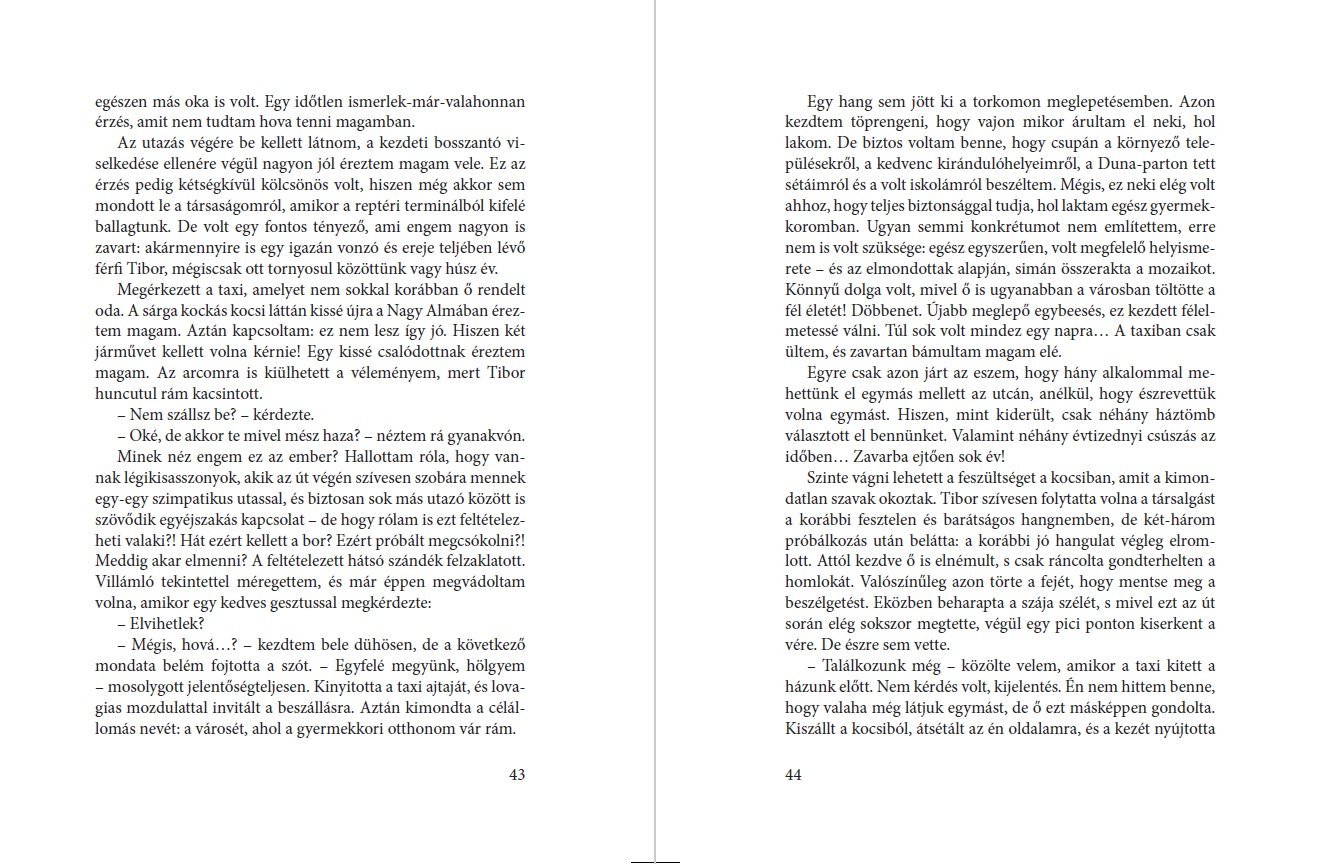 – Mégis, hová…? – kezdtem bele dühösen, de a következő mondata belém fojtotta a szót. – Egyfelé megyünk, hölgyem – mosolygott jelentőségteljesen. Kinyitotta a taxi ajtaját, és lovagias mozdulattal invitált a beszállásra. Aztán kimondta a célállomás nevét: a városét, ahol a gyermekkori otthonom vár rám.